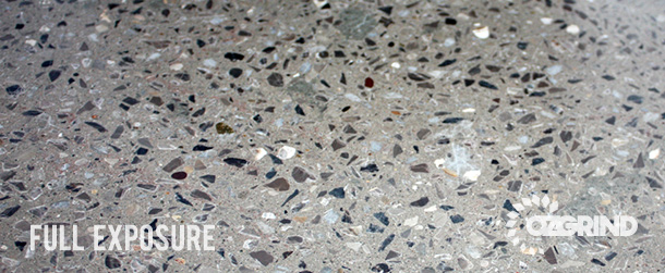 The depth of the grind, or how much of the top of the concrete slab is removed will determine how much aggregate (or stone) is exposed. Below are some examples of polished concrete with different levels of exposure: